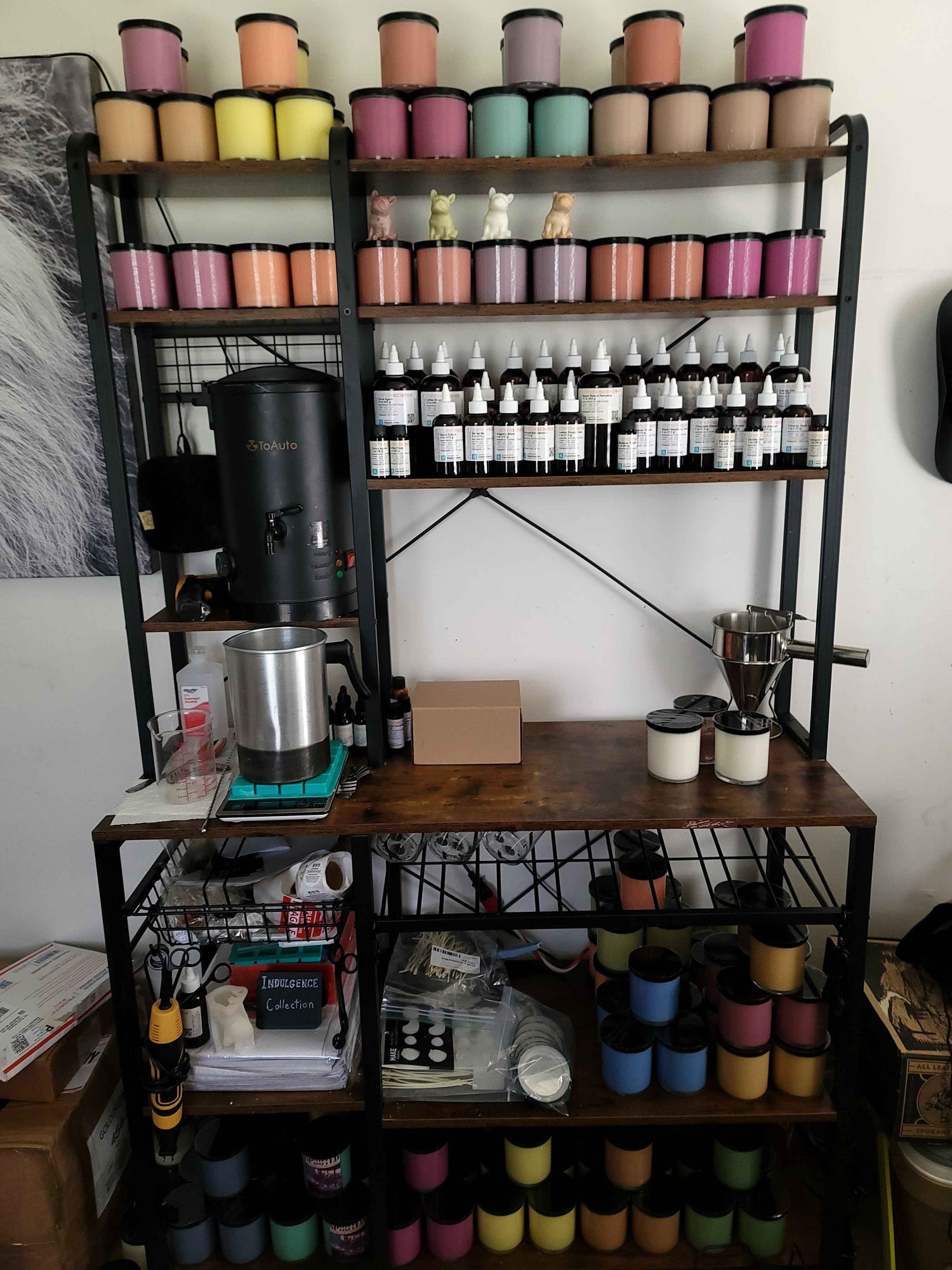 Here you can see my main workstation, this is where all the candles get made! From wicking, to blending, to pouring, to labeling. They're all small batch made in one room, very diligently.